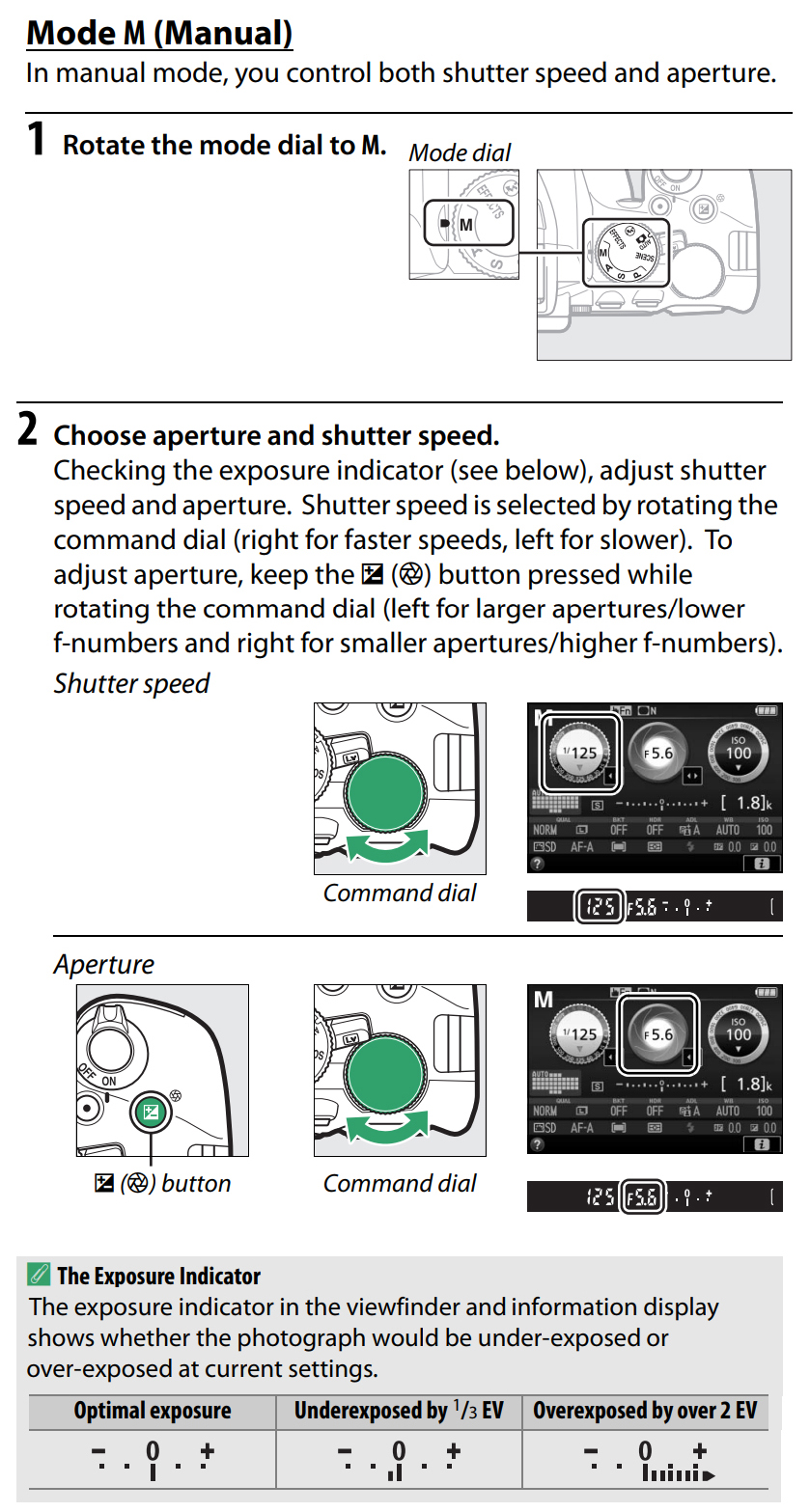 The Shutter Speed, Aperture and ISO represent the Exposure Triangle and when the Exposure Indicator is set to zero these three items are in balance creating the proper exposure. Changing the value of one requires adjustment of the other two settings, otherwise, the exposure will be overexposed (too light) or underexposed (too dark).